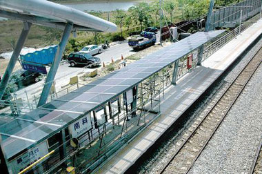 4月22日是世界地球日,臺(tái)南縣環(huán)保局及縣府工務(wù)處22日聯(lián)合在南科車站宣導(dǎo)綠能科技,臺(tái)南縣長(zhǎng)蘇煥智說(shuō),臺(tái)鐵南科站六月底啟用,除太陽(yáng)能發(fā)電具有綠色科技概念,因?yàn)檐囌就ㄜ嚕ㄇ谧蹇衫么蟊娺\(yùn)輸系統(tǒng)到南科園區(qū)各廠上班,先搭火車到南科站,再搭園區(qū)接駁車,更能有效節(jié)能減碳。