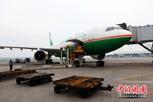 中新網重慶5月26日電 (記者 郭晉嘉)隨著富士康、英業達等臺企入駐重慶,今年以來渝臺直航航線客運持續火爆,貨運開始升溫。5月26日,臺灣立榮航空的B7192航班由麥道90機型改為252座的空客330機型執飛,這是重慶—臺灣航線首次采用大型寬體機,也是首次大批運送貨物。