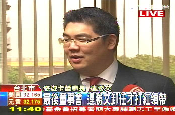 中新網(wǎng)5月27日電 據(jù)臺(tái)灣TVBS電視臺(tái)報(bào)道,悠游卡公司董事長(zhǎng)連勝文,因?yàn)榻】翟蛘?qǐng)辭,今天是最后一次主持董事會(huì),主持的是自己與新董事長(zhǎng)劉奕成的交接,連勝文特別打上紅領(lǐng)帶,笑說(shuō)自己任職1年9個(gè)多月,今天第一回挑紅色,因?yàn)閷?shí)在太開心了。