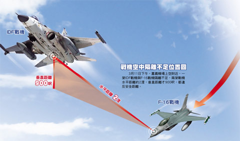空軍臺南聯隊1架IDF戰機編隊飛行未依塔臺管制,在4000呎高空與嘉義聯隊1架F-16戰機相距僅約900呎,發生嚴重隔離不足。
