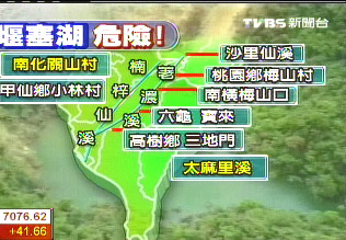 光是高屏溪上游就有8個堰塞湖潰堤,影響地區(qū)包括梅山、六龜、寶來、高樹、三地門、小林村等,至于南化關(guān)山村和臺東的太麻里溪則是拉警報(bào)。