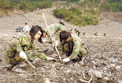 新開(kāi)部落迄今仍有二十五位罹難者被掩埋在三層樓高的土石堆,前天臺(tái)軍在韓籍救難隊(duì)員指導(dǎo)下,趴在土石堆上,試圖循著臭味發(fā)現(xiàn)遺體。