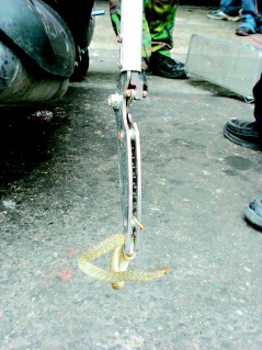 一起停等的騎士看了都嚇了一跳,要王婦把車推到武陵派出所,請警員幫忙抓蛇;她直奔派出所,但警員不諳抓蛇,再請來消防隊員幫忙。