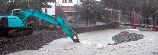 災情最嚴重的是冬山鄉的太和村,上游的十三份溪在上次芭瑪臺風來襲時,溪里大量土石淤積,還來不及全部清除,這次又逢大雨,溪水暴漲淹到路面,多條農路封閉。縣府工務處緊急出動3臺挖土機疏浚十三份溪,避免溪水的水位持續升高,造成更嚴重的災情。
