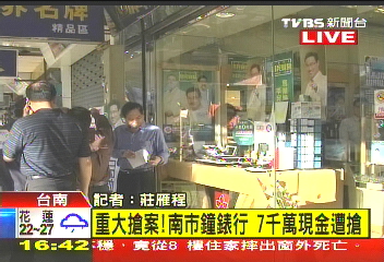 中新網(wǎng)11月23日電 據(jù)臺(tái)灣TVBS報(bào)道,臺(tái)南市一家鐘表行老板,23日下午到銀行提領(lǐng)新臺(tái)幣7000萬(wàn)元現(xiàn)金,準(zhǔn)備買黃金用,沒(méi)想到回家途中遭歹徒尾隨,回到店內(nèi)時(shí)歹徒開(kāi)槍搶走現(xiàn)金,流彈還意外波及在店內(nèi)的老板侄女,侄女小腿中彈,送往成大醫(yī)院急救,歹徒則逃逸無(wú)蹤。