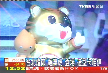中新網2月1日電 據臺灣TVBS報道,2010年臺北燈節主燈座1日亮相,一座長相渾圓可愛的福氣虎,取名為“Hoki”(閩南語:福氣),這只福氣虎有20米高,旁邊還圍繞著5位花精靈,整個組合不僅色彩十分豐富,還會搭配雷射光和水舞秀,甚至還會釋放花香,讓民眾在賞燈時,有豐富的感官享受。