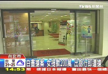 中新網2月2日電 據臺灣TVBS報道,臺北市龍江路上的永豐銀行,下午發生搶案,一名女子從銀行走出來,隨即被歹徒盯上搶走約167萬元。