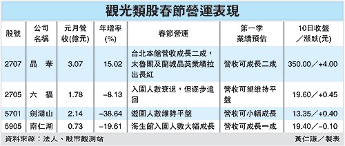 劍湖山集團總經理張錦榮表示,雖受天氣影響,使得游園人數并未大幅成長,但由于春節天數長,今年劍湖山業績和去年相較,應可維持平盤,如再加上劍湖山王子飯店仍有不少人入住,營收可維持平盤。