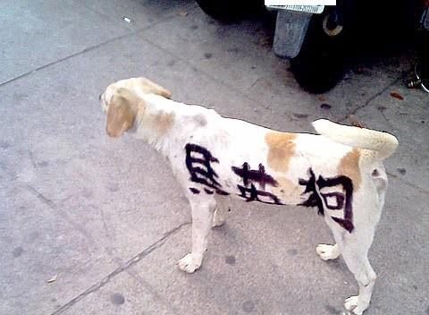 中新網4月14日電 據TVBS報道,臺灣政治戰火延燒到流浪狗身上,臺中中港轉運站前幾天出現一只白底黃花的流浪狗,狗身上被人用黑色噴漆寫了“馬英狗”三個字,民眾感覺有人把對政治的不滿,發泄在狗身上,實在很不人道,如果碰到護馬人士,這只狗啟不是要遭殃。