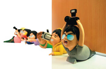 她設計6種不同的狗仔隊造型,包括攝影記者高舉雙手拿著相機、女記者拿著麥克風往前擠、攝影記者扛著攝影機側身拍照等。陳郁青表示,通常門縫都有一點小空隙,加上狗仔隊門擋后,好像狗仔隊從門縫中爬出,她自己也覺得很有趣。