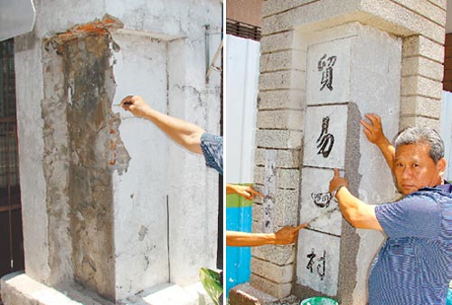 中新網(wǎng)5月20日電 據(jù)臺灣《聯(lián)合報(bào)》報(bào)道,臺南縣仁德鄉(xiāng)二空眷村將拆除改建大樓,包商日前把村門口由宋美齡落款題字“貿(mào)易四村”的石柱拆除,遭眷戶抗議并報(bào)警,指軍方與包商竊盜眷村文物。包商昨天把落款貼回,但損裂痕清楚可見。