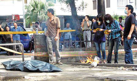 中新網(wǎng)6月10日電 據(jù)臺灣《中國時報》報道,臺灣高雄縣市交界的崗山仔地區(qū)9日中午連續(xù)傳出槍響,水果攤商翁文定為攤位糾紛,持槍在市場朝同行黃春生近距離開槍,隨后騎車往崗山仔公園,打手機給女性友人告知“我要自殺了”,就朝太陽穴開槍當場斃命,黃姓男子則身中四槍被送往醫(yī)院急救,性命垂危。