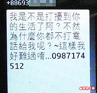 民眾藍(lán)先生昨日在臺(tái)北市議員李文英陪同下出面控訴,他十七歲兒子前天凌晨收到“為什么你都不打電話給我呢?這樣我好難過(guò)唷”短信,以為是同學(xué)而回?fù)埽钊战荧@電信業(yè)者通知暴增一萬(wàn)八千多元通話費(fèi)。