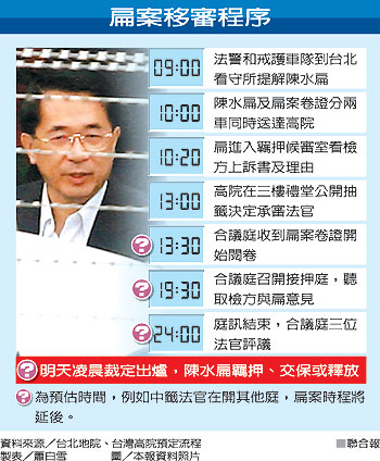 高院將由三位庭長、兩位法官組成的五人小組,于下午1點(diǎn)在三樓禮堂公開抽簽分案,從81位庭長、法官當(dāng)中抽出承審股別,扁案卷證就送合議庭辦公室;只要不是下午有庭期的合議庭,原則上會立即閱卷,開庭決定是否接押阿扁。