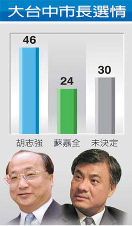 中新網6月4日電 據臺灣《聯合報》報道,臺中市接連發生重大治安和警紀案件,《聯合報》對大臺中市長最新選情調查發現,胡志強目前雖以46%支持率領先蘇嘉全22%。