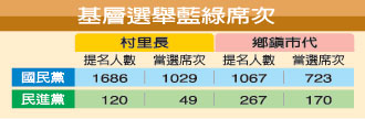 中新網(wǎng)6月13日電 據(jù)臺灣《聯(lián)合報》報道,臺灣17縣市基層選舉結(jié)果12日晚揭曉,國民黨(含以無黨籍參選的黨員)拿下1988席村里長、1187席鄉(xiāng)鎮(zhèn)市民代表,各約占總席次半數(shù),輔選系統(tǒng)評估,藍軍總當(dāng)選席次明顯高于綠營,藍綠基層版圖變動不大。