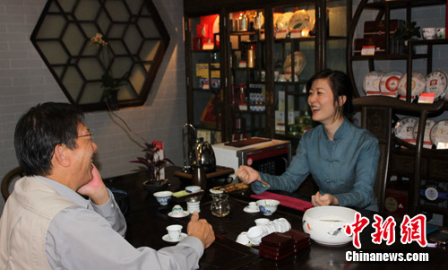來自廣州茶文化促進會的資深評茶師張沙小姐,穿著一襲中國傳統的扣襟唐裝、腕戴玉石手鐲,一副古質美女氣質。她泡茶姿勢一招一式都見功夫,而談起茶來更是滔滔不絕。泡了一壺新茶鐵觀音,她告訴客人們:“第一泡,味同嬰兒般柔滑”、“第二泡,味如青年般活力”、“第三泡,味如成熟少婦的韻味”……說至此,圍坐一起的茶客不禁笑將起來。