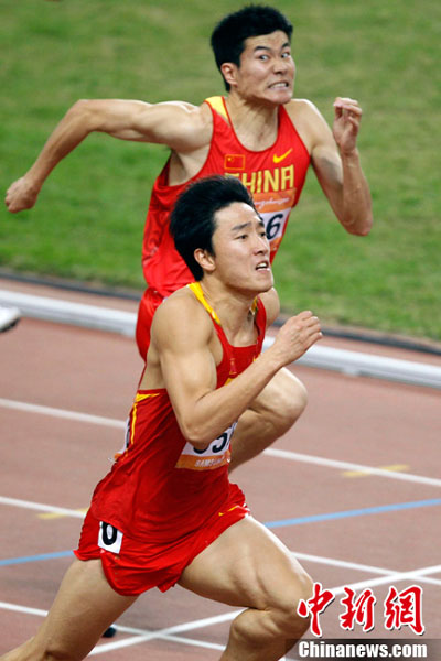 中新網11月24日電 在24日晚結束的廣州亞運會田徑男子110米欄決賽中,“飛人”劉翔以打破亞運會紀錄的13秒09的成績奪得金牌,史冬鵬奪得銀牌。