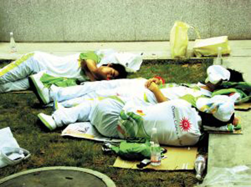 對一些室外志愿者來說,一天中需要忍受的還包括草坪上吃飯、睡覺……