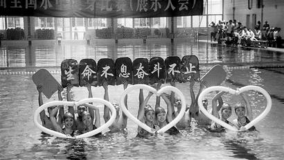 在“你說你的美麗已經不再,地動山搖將你變得蒼白”的朗誦聲中,阿壩師專拉拉操隊員開始了他們的自選動作表演——一套反映從地震發生時的無助到重建家園信心十足的水中健身操。