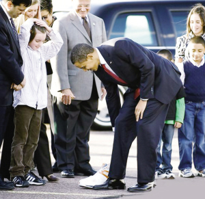 眼見(jiàn)奧巴馬下了飛機(jī)后,看到地上這只球鞋,還特別彎下腰,笑著拿自己皮鞋與奧胖這只大鞋比試一下,果然奧巴馬尺寸“小巫見(jiàn)大巫”,全場(chǎng)接機(jī)人員都笑成一團(tuán)。據(jù)悉,這只球鞋為橘色與白色相間,上面有著奧尼爾個(gè)人簽名。 ○張喆