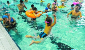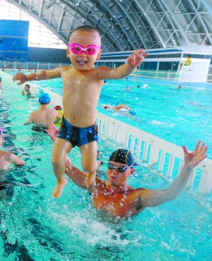 伸伸腿,彎彎腰,一番準備后,小劉暢迫不及待地跑到泳池邊,父親劉先生抱起兒子,撲通一聲丟下水,接著又一把撈了起來。記者嚇了一跳,耳邊卻傳來小家伙“咯咯”的笑聲。“我給他試試水,適應一下。”劉先生解釋,劉暢不怕水,對水有一種天生的親切感,這種夸張的“試水”方式,不會嚇到他,反而讓他感覺很“爽”。