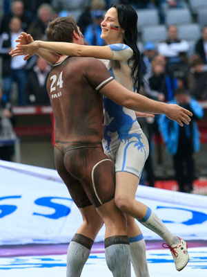 德乙聯(lián)賽第22輪,慕尼黑1860在主場以5:1大勝圣保利。 終場前從主客兩隊的看臺上分別躍下一個身穿1860隊服的姑娘和一個身穿圣保利隊服的小伙,兩人一路狂奔來到球場中圈,旁若無人的熱吻起來。仔細(xì)觀察才能發(fā)現(xiàn)他們所穿的“隊服”的奧秘----這對情侶都只穿了一條內(nèi)褲,他們身上的衣衫完全是足以亂真的人體彩繪。現(xiàn)場保安也為這浪漫一幕所感動,他們面帶微笑將這對情侶請出草坪。(圖片來源:1860隊官方網(wǎng)站)