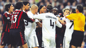 盡管皇馬2:3主場不敵AC米蘭,賽前成為焦點的米蘭舊將卡卡也表現不佳,但皇馬隊長勞爾的表現卻可圈可點:助攻隊友德倫特攻入一球,而且在比賽中還破門首開紀錄,憑借此球勞爾的個人歐冠進球數為66球,占據歐冠歷史個人射手榜榜首。然而,就是這位球技、職業素養、人品都還不錯的32歲老將,卻成為兩隊此戰爆發肢體沖突的主角。