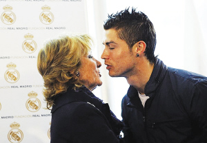 北京時間昨天是C羅的生日,他和皇馬主席弗洛倫蒂諾一起在伯納烏參加了一項新聞發布會。皇馬俱樂部與馬德里大區達成了合作協議,皇馬基金會將會投資幫助馬德里大區那些未成年人、外國移民等等。在新聞發布會現場,C羅和弗洛倫蒂諾開起了玩笑。皇馬主席問C羅“你現在多大了”,C羅回答“我20歲了”。弗洛倫蒂諾當即揭穿了C羅的謊言:“你已經25歲了,你竟然已經這么老了!”當然,這次玩笑以全場歡笑告終。 作為皇馬代表,C羅還與馬德里大區女主席阿吉雷進行了親密接觸。盡管阿吉雷的年齡足以當C羅的奶奶,但葡萄牙人還是跟她來了一個貼面熱吻。在被C羅熱吻之后,阿吉雷顯得非常高興,立刻說:“C羅是世界上最出色的球員,沒有之一。”同時阿吉雷也宣稱,“皇馬是歷史上最出色的足球俱樂部。”