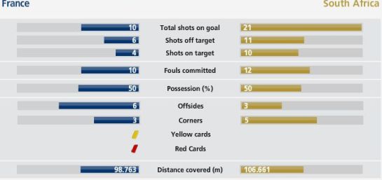 此外,雖然法國隊在大部分的比賽中都以10人應戰,但是其控球率卻與南非隊一樣,各為50%。越位方面,法國隊6次,兩倍于南非隊的3次。角球數字則是南非隊多于法國隊,南非隊獲得了5個角球,其中一球攻破了法國隊的球門,法國隊則只有3次。