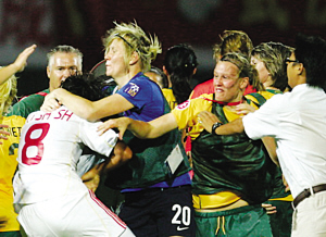 人在足球場(chǎng),女子也瘋狂!8月3日晚上的武漢漢口體育場(chǎng),在亞青賽中國(guó)隊(duì)與澳大利亞隊(duì)的比賽結(jié)束之后,溫文爾雅的女孩們也動(dòng)起了老拳,場(chǎng)上三四十人亂戰(zhàn)成一團(tuán),經(jīng)過(guò)亞足聯(lián)官員長(zhǎng)達(dá)十分鐘的調(diào)解,事態(tài)才暫時(shí)得到平息。然而,心懷不滿的澳大利亞女足姑娘們,還意猶未盡,在回到更衣室后,她們瘋狂地拆卸了更衣室的衣柜,砸成一團(tuán)。而她們的教練也按捺不住心中的憤懣,在發(fā)布會(huì)上當(dāng)著眾多記者面,砸掉了手中的礦泉水瓶,險(xiǎn)些砸到一名中國(guó)記者。一場(chǎng)普通的比賽,以這樣的方式收?qǐng)觯磥?lái),足球之亂,并非只在中國(guó)球員身上,也并非只是成年隊(duì)球員。