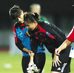 中澳比賽進(jìn)行到下半時(shí)后半段,屈珊珊后場(chǎng)開(kāi)球拖延時(shí)間被黃牌警告。傷停補(bǔ)時(shí)階段,門將張?jiān)匠鰮羰軅蟮沟夭⒔邮荜?duì)醫(yī)進(jìn)場(chǎng)治療,此時(shí)澳大利亞球員杰西卡卻認(rèn)為中國(guó)隊(duì)隊(duì)醫(yī)故意拖延比賽時(shí)間,與中國(guó)隊(duì)員發(fā)生肢體沖突。印度主裁判本迪卡在與韓國(guó)助理裁判商量后,將澳大利亞隊(duì)杰西卡紅牌罰下,這引起了澳大利亞主教練的大大不滿。