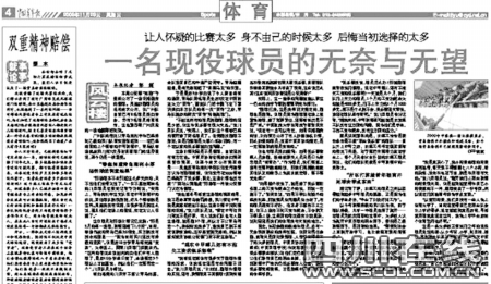 昨日,《中國青年報》體育版頭條刊登了一篇題為《一名現役球員的無奈與無望》的報道,此文便是以“吊射門”作為背景,某門戶網站摘錄后將標題改為《川足球員稱兩名隊友打假球被開除后悔當初練足球》。雖然這篇報道并未點出兩位“打假球球員”的真實姓名,但此文一經網絡轉載,立刻引起了強烈反響。本報記者昨日輾轉聯系上了這兩名球員的其中一位,試圖揭開謎底,但他卻稱自己是因傷離隊,并非如報道中所述的“打假球被開除”。