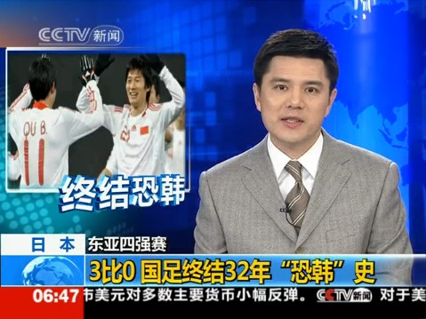 央視新聞以《3比0 國足終結32年“恐韓”史》為題,詳細的描述了三粒進球的過程。在這段長達1分多鐘新聞中,還配有國足比賽的實況錄像和現場圖片。最后,新聞還簡要回顧了國足32年“恐韓癥”的歷史,并評論昨天的比賽,是以“一場完勝終結了32年的恐韓癥歷史”。