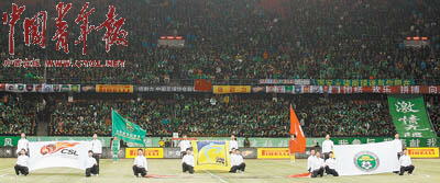 中國足協超級聯賽揭幕戰今晚在北京工人體育場舉行。北京國安隊以2∶0戰勝了南昌八一隊。賽場廣播提前兩個小時就開始循環播放“做文明觀眾、理智對待比賽輸贏”的宣傳口號,場內為南昌八一隊挑戰衛冕冠軍助威的近400名客隊球迷,在兩隊武警的保護下被隔離在球門后的看臺,周圍則是近5萬名狂熱的主隊球迷。