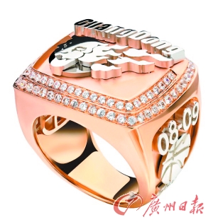 據(jù)鉆戒設(shè)計(jì)人員透露,為使設(shè)計(jì)更加新穎,在材質(zhì)的挑選上采用了正逐漸成為全球珠寶市場主流的18K玫瑰金,每枚重達(dá)40克,頂部鐫刻著廣東隊(duì)的隊(duì)標(biāo),環(huán)繞以79粒晶瑩的高品質(zhì)鉆石;戒指的右側(cè)面鐫刻著“08-09”的字樣和CBA籃球面孔的標(biāo)志,左側(cè)是球員姓名及球衣號碼;指環(huán)下方用鐳射技術(shù)刻有“戴夢得”的字樣。整個戒指通體造型渾厚穩(wěn)重,溢彩流光,充分表現(xiàn)出冠軍球隊(duì)的王者之氣。戒指上的信息全部采用工藝復(fù)雜的分件倒模技術(shù),呈現(xiàn)凸字效果,增加戒指立體感及時尚感。