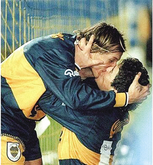 阿根廷人的豪放這一刻展現(xiàn)得淋漓盡致,主角是球王和風之子。當時風之子接到球王的妙傳破門得分,兩個人當場不顧全場所有觀眾和其他的隊友激吻在一起,長達6分鐘,而且還是“舌吻”!當時引起了全世界的轟動!好戲還在后頭:卡尼吉亞的老婆說:“馬拉多納是同性戀,他喜歡親吻卡尼吉亞的嘴唇!碑斎焕像R很生氣,但是他表示:“看在卡尼吉亞的份上就不追究了!”