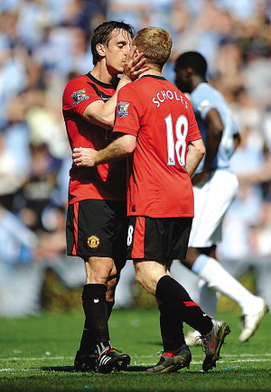 英超第35輪的一場強強對決,自然是曼城斯特市的同城德比。最終,曼聯(lián)憑借35歲的老將斯科爾斯在下半場補時第2分鐘的頭球絕殺,在客場以1:0險勝同城死對頭曼城隊。令人意外的是,同為35歲的曼聯(lián)隊長加里·內(nèi)維爾居然在場上公然激吻進球功臣斯科爾斯以示慶祝。