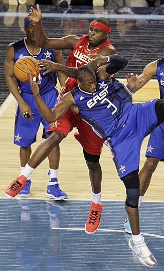 雖然科比、艾弗森、保羅和羅伊等巨星的退出讓人感到遺憾,但以詹姆斯等為首的眾位明星仍然奉獻(xiàn)了一場精彩的表演。東部隊(duì)的韋德得到28分、11次助攻、6個(gè)籃板和5次搶斷,詹姆斯得到25分、6次助攻和5個(gè)籃板,波什得到22分和10個(gè)籃板,霍華德得到17分、5個(gè)籃板和3次蓋帽,約翰遜得到10分,羅斯和霍福德各得到8分。西部隊(duì)的安東尼得到27分和10個(gè)籃板,諾維茨基得到22分,比盧普斯得到17分和5次助攻,杜蘭特得到15分,威廉姆斯得到14分和6次助攻,加索爾得到13分,斯塔德邁爾得到12分和10個(gè)籃板。
