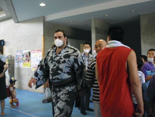 這次率隊巡業的是日本相撲橫綱的朝青龍。為了對孩子們負責,預定舉行的力士與孩子們的“兒童訓練”不得不中止下來。許多孩子為此遺憾連連,在現場向戴著口罩的大相撲不斷地揮手致意。