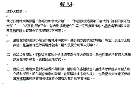 就在新聞鬧的沸沸揚揚的同時,林嘉欣所屬的香港經(jīng)紀(jì)公司星皓昨天發(fā)表聲明,提到“公司和林嘉欣合作9年,堅持展現(xiàn)她健康、清新及獨立的藝人形象。2010年彼此達(dá)成獨家代理合作關(guān)系。”更強調(diào)“近日出現(xiàn)對林嘉欣抹黑、詆毀的傷害性消息,正在調(diào)查消息的源頭,并保留法律追究的權(quán)力。”