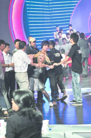 湖南衛視的《快樂男聲》剛剛落下帷幕,東方衛視的《中國達人秀》即將迎來高潮。不過,在前日舉行的《中國達人秀》首場半決賽中卻發生了意外狀況,被淘汰的選手陳靜大鬧現場,最終周立波動用了自己的保鏢才將她和她的丈夫請出舞臺。而一旁的評委高曉松說了一句“上海男人慫”,也惹得眾多網友不滿。昨日,這段從節目中刪除的視頻流傳到了網上,成為網友熱議的焦點。對于選手的偏激行為,昨日《中國達人秀》的宣傳總監陸偉解釋說:“陳靜未能晉級的失望心情我們可以理解,但她在現場選擇這樣的方式來發泄,顯得有些過激,因此在節目最后公開播出的版本中,刪去了這段實況。”