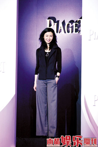 張曼玉以形象大使的身份出席某珠寶品牌活動,黑色修身上衣搭配煙灰色寬松長褲子, 簡潔卻富設計感,搭配伯爵的新款珠寶,明麗動人。