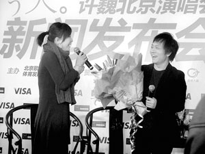 歌手許巍將于4月10日在北京工人體育館舉行個(gè)人演唱會(huì)——“今天”,這一消息昨日在京發(fā)布。好友——歌手葉蓓手捧鮮花抵達(dá)發(fā)布會(huì)現(xiàn)場(chǎng)道賀。