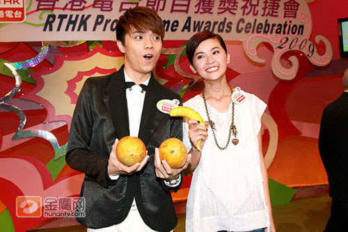 蔡卓妍(阿Sa)、張敬軒6日為港臺獲獎祝捷會擔任頒獎嘉賓,會上公布0八至0九年度獲得的七十七個國際及本地電視獎項。活動后,阿Sa與軒仔影合照,軒仔拿著兩個大木瓜遞給阿Sa,并笑說:“以形補形。”