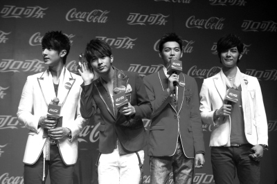 作為目前最受歡迎的青春偶像組合,“飛輪海”4位帥哥成員吳尊、炎亞綸、汪東城和辰亦儒齊集上海,推出今年可口可樂全新廣告。由于早有“飛輪!背蓡T不和的傳聞,吳尊和“大哥”汪東城在發(fā)布會上更是“明爭暗斗”,但記者一提到前輩F4,四人均立刻不屑道,“他們只是機遇比較好”。