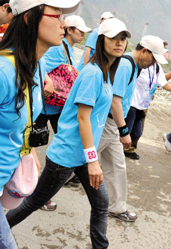 前天早上8∶00,壹基金及社會各行的義工共同組成“一家人”,乘坐十幾輛中巴,從成都市區(qū)浩浩蕩蕩地開赴汶川。約11∶00左右,車隊(duì)順利到達(dá)映秀縣的入口。12∶00左右,在舉行簡單的儀式后,一行人從映秀鎮(zhèn)5·12震中遺址前出發(fā),沿著塌方的公路,一直往兩公里外的終點(diǎn)牛眠溝走去。明星們也和其他人一樣,穿著壹基金志愿者統(tǒng)一的藍(lán)色T恤,素顏行走在隊(duì)伍中。