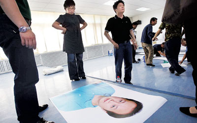 上午10時(shí)許,大廳入口處已經(jīng)擺開一排長(zhǎng)桌,工作人員正對(duì)著筆記本挑選羅京的相片,仔細(xì)確認(rèn)相片的尺寸后,交代人員去打印以備布置靈堂之用。