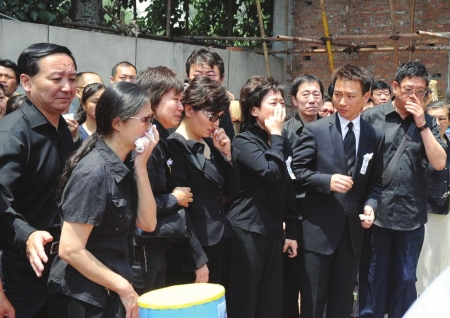 昨天清晨5點40分,本報記者提前三個多小時來到八寶山殯儀館東禮堂,已有部分從郊區自發趕來送別羅京的觀眾,陸續抵達八寶山。清晨6點30分,羅京遺體被家人和同事接出307醫院的太平間,送往八寶山公墓。兒子羅疏桐懷抱父親的遺像走在最前面,羅夫人劉繼紅難掩悲痛,含淚走在后面。羅京的靈柩上覆蓋著黨旗,靈柩被抬入殯儀館的途中,人群中不時有人輕聲送別,“羅京一路走好”,據了解,羅京的母親昨日沒有現身,時至今日老人仍不知心愛的兒子已離開人世。羅京躺在鮮花叢中,身著深色西服,系彩色領帶,面容安詳,平和如舊。