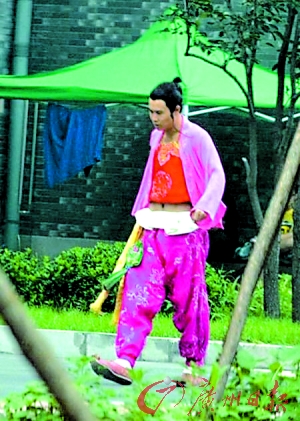 當日,小沈陽在幾位工作人員的陪同下走出攝影棚。一身“紅妝” 的他,里面竟穿了一件露出肚臍的大紅肚兜。這身裝扮,看起來更像是表演東北二人轉!看來,在劇中負責搞笑的小沈陽,穿著打扮也跟以前的老本行相似,演起來應該也會更加得心應手。
